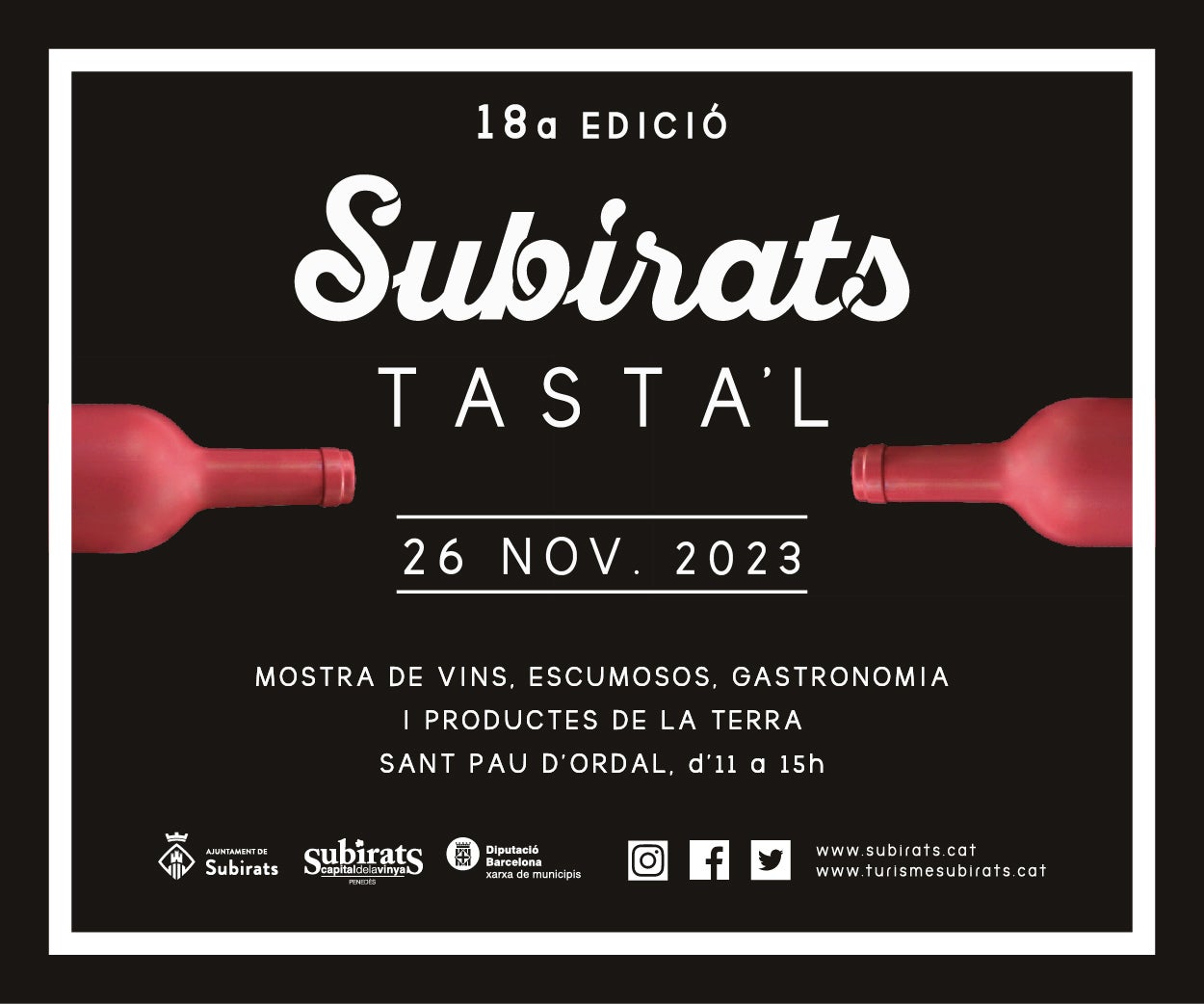 El diumenge 26 de novembre, d’11 a 15 hores, Sant Pau d’Ordal acollirà el 18è Subirats Tasta’l, una fira per tastar la qualitat dels vins i escumosos dels cellers del municipi, la gastronomia local i posar en valor els productes del territori i el patrimoni.