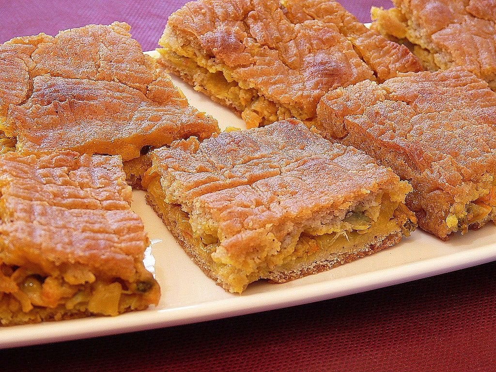 A la llista d’ingredients veiem que porten un pisto de verdures a base de tomàquet, ceba, albergínia, carbassó, pebrot verd i pebrot vermell; en la meitat d’elles la ceba és l’ingredient principal, per davant fins i tot de la quantitat de farina que s’utilitza per a la massa. La tonyina és un ingredient minoritari, que s’afegeix més que res per donar sabor al pisto.