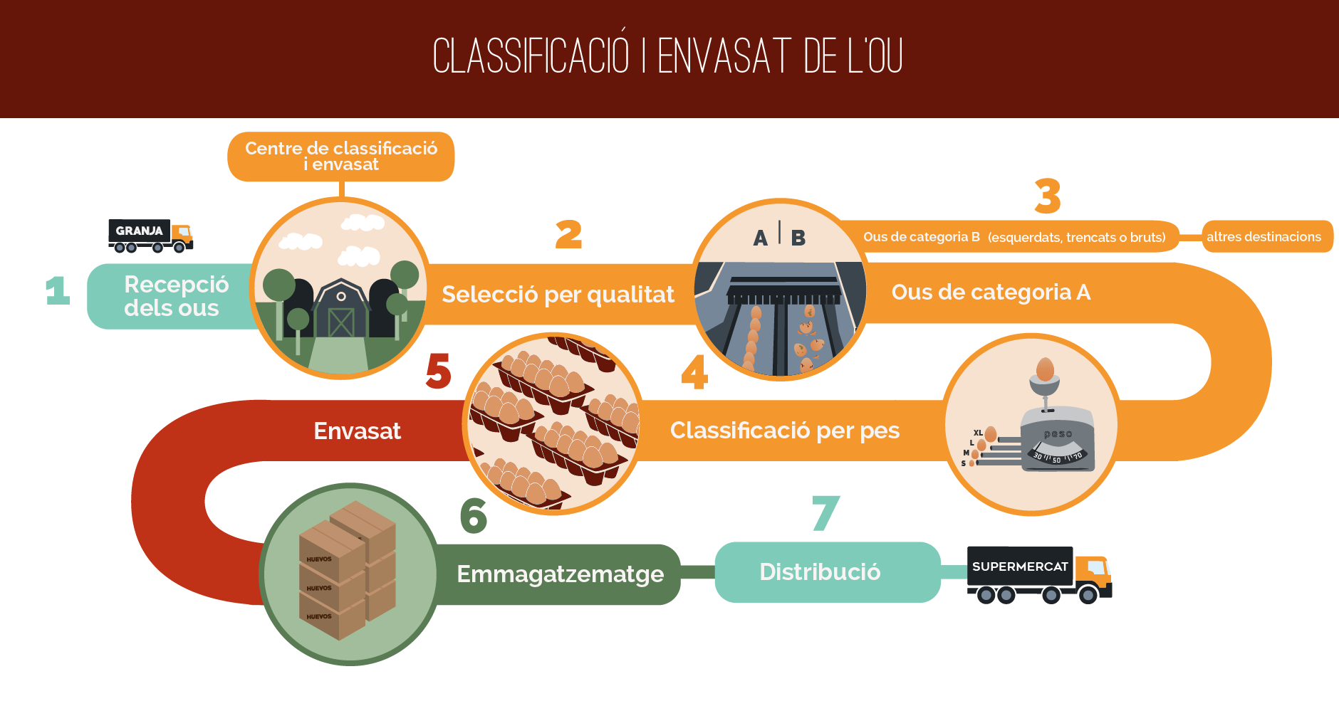 Moltes granges tenen els seus propis centres de classificació annexos a la mateixa granja. En aquests casos els ous arriben directament al centre, mentre que les granges que no disposen de centre d’embalatge propi envien els ous a centres externs. Aquests reben els ous provinents de diferents granges i per garantir la traçabilitat del producte els marquen amb el codi de la granja d’on provenen.