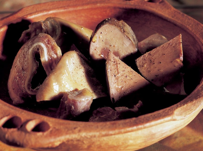 Si us animeu a fer aquest aperitiu, un cop cuits tots els ingredients, s’han de tallar en daus ben petits però de mida suficient per tal que es puguin punxar amb la forquilla o amb un escuradents, amanir-los generosament amb sal i pebre negre, ruixar el plat -amb mesura- amb el millor vinagre de vi que pugueu trobar. És important tenir en compte que el vinagre no ha de ser en cap moment protagonista del tast, només hi ha d’aportar un punt d’acidesa que anirà molt bé per equilibrar el greix que porten algunes de les carns. Finalment, cal amanir amb un raig d’oli d’oliva extra verge d’arbequina, que aporti untuositat. Disposar-ho en un plat o safata de servei i portar-lo a taula.
