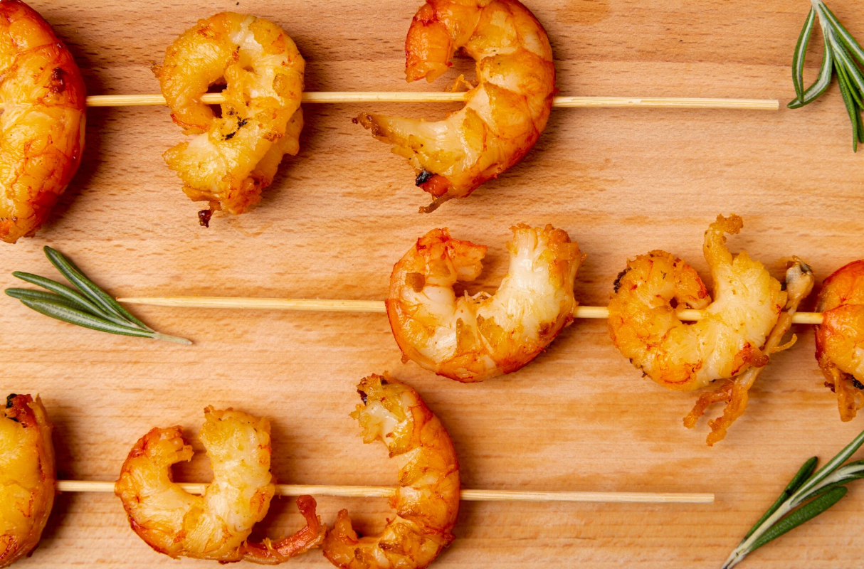 Mentrestant, es preparen les broquetes. En uns escuradents curts o broquetes petites es van alternant cues de gambes cuites i pelades, daus de síndria i fulles de menta fresca, que aporten un contrapunt aromàtic molt agradable i una nota vegetal refrescant. Les broquetes s’han de conservar també a la nevera fins al moment del muntatge per garantir que arribin a taula a una temperatura òptima.
