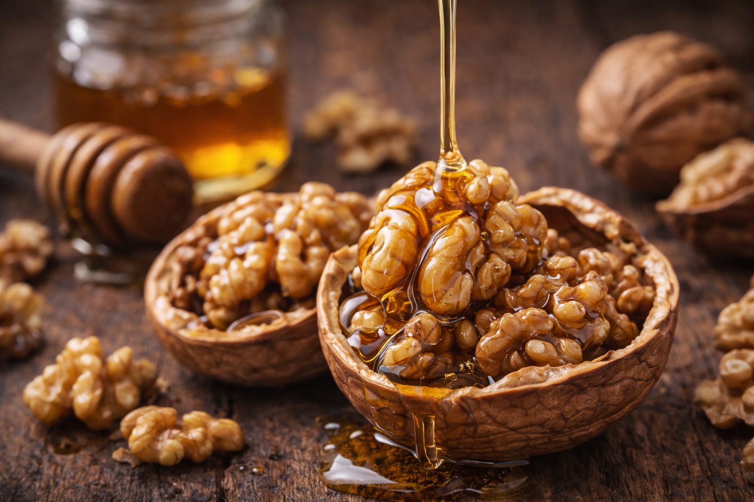 Les nous amb mel, tal i com diu el nom, són simplement nous trencades i mel, però és una barreja molt afortunada, un plat per a gent llépola, i es menja a cullerades. No cal dir que són unes postres dolcíssimes i, per tant, no es poden menjar en grans quantitats perquè enfiten d’allò més, però en la mesura adequada agraden a tothom. En fan, que jo sàpiga, a l’Alt Urgell, el Montsià, el Besierés i el Montpellerenc (Baix Llenguadoc), però potser el costum està més escampat perquè és una menja molt antiga i ja la trobem en un text del metge Diocles (segle IV aC) transcrit per Ateneu de Nàucratis en El banquet dels savis: