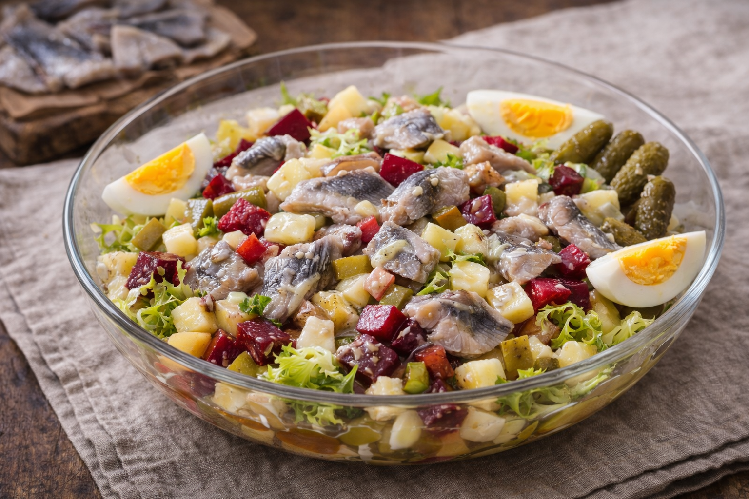 Feu dessalar els arengs amb aigua (o amb llet) durant tota la nit (o menys temps, si són fresques). Escorreu-les bé i esqueixeu-les. Feu bullir les patates, començant amb aigua freda, peleu-les i talleu-les a daus o rodelles. Peleu la poma i talleu-la a trossets. Talleu la remolatxa a tallets o rodelles. Netegeu l’escarola i feu-ne petits bocins.