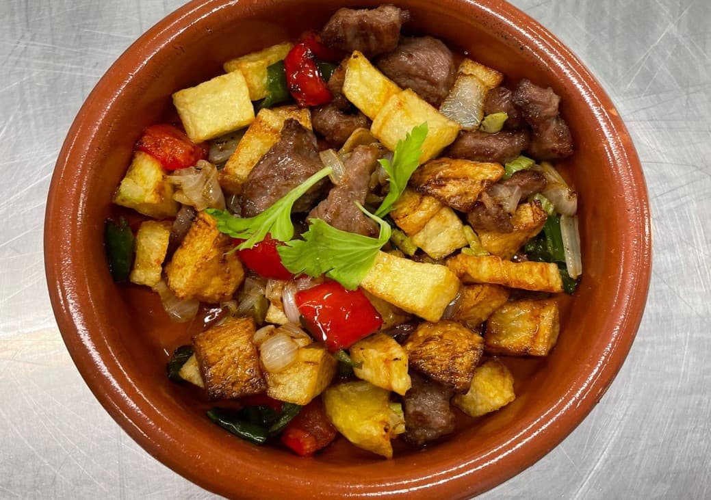 Ingredients (4 racions): 600 g de freixura de corder (fetge, lleu, cor, ronyons, melsa, llengua, etc.), 500 g de patates, 2 pimentons verds, 1 ceba, alls, vi blanc, pebre, oli d’oliva i sal.