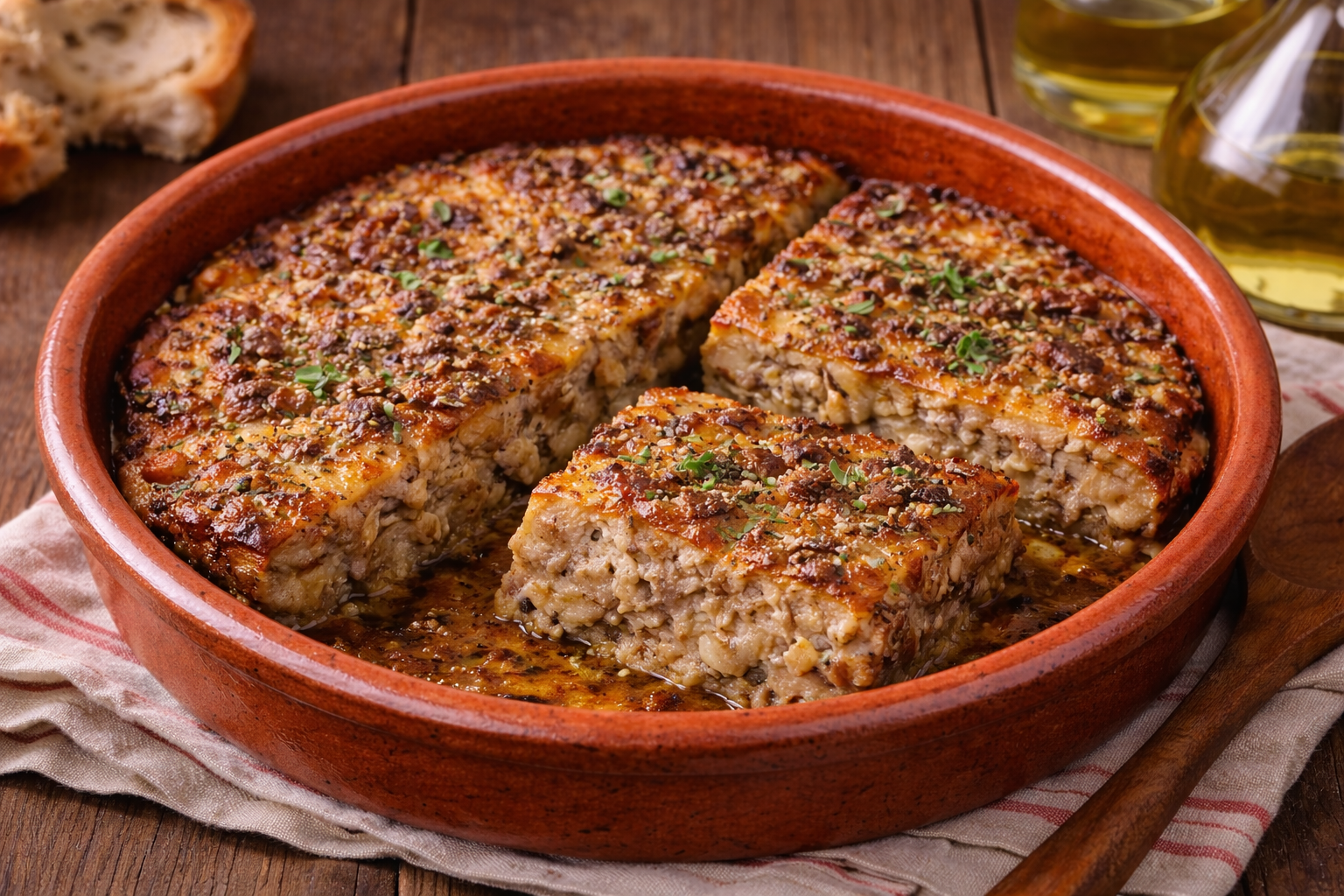 Com si fos un cartutxo de dinamita: Orelles, morro i peus del porc, bullits, fets daus o triangles, més ous batuts, ensaïmada esflorada o coca de patata esmicolada. La massa mig espessa i tota cuita al forn dins dues olles baixes de test, una dins l’altra, la de baix amb aigua. Aquest és el relat sumarial, els ingredients i el gest per fer la greixonera dels últims dies (de carnaval o carnestoltes, també dita ‘de peus de porc’). No serà alabada com cuina de disseny ni de reconstrucció.
