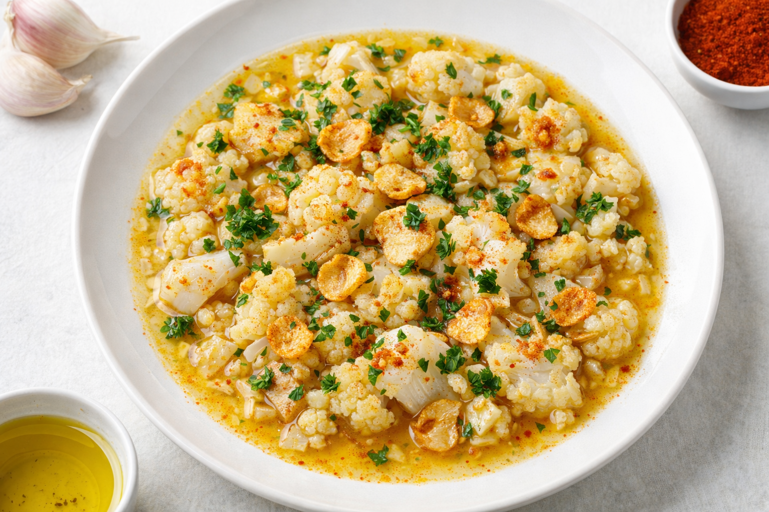 Ingredients (4 racions): 600 g de bacallà, 500 g de coliflor, 2 cabeces d’all, julivert, pebre roig, oli d’oliva i sal.