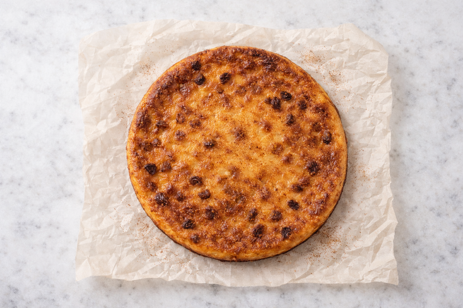 Preparació: de primer aixafarem el formatge amb una forquilla, el posarem en un bol, hi afegirem l’ou, les panses (que hauran estat un parell d’hores a remull), la farina, el sucre i un pessic de canyella i ho barrejarem ben barrejat. En acabant ho abocarem en un motle de vores baixes (prèviament oliat), ho escamparem perquè hi haja per tot una capa del mateix gruix i ho enfornarem, a 200º. Al cap d’uns trenta minuts ho traurem i ho deixarem refredar.