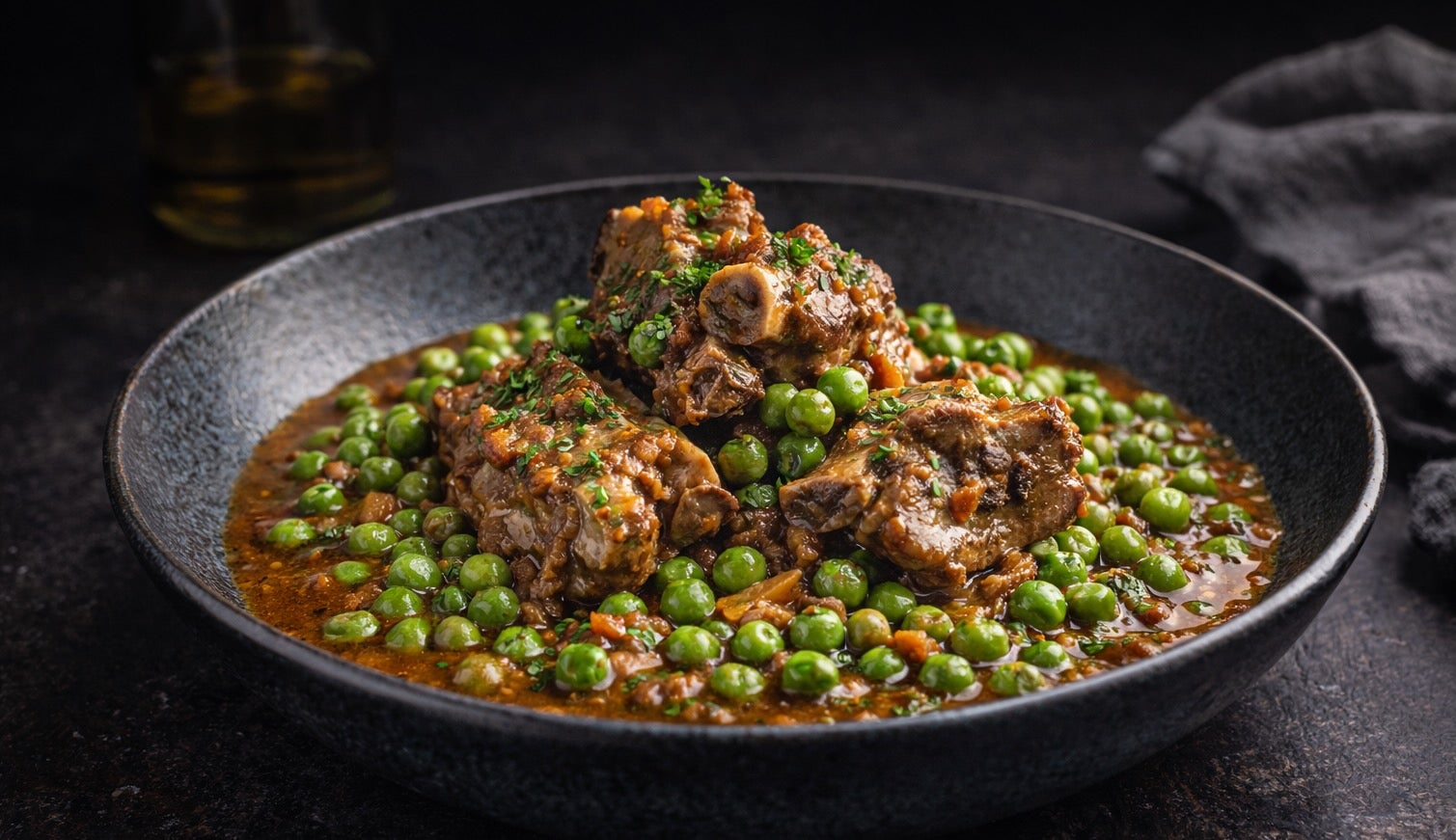 Preparació: de primer trossejarem la carn i, en acabant, pelarem i trinxarem la ceba i mitja dotzena d’alls. Seguidament pelarem i picolarem les tomaques. A continuació posarem un raig d’oli en una cassola de terrissa i la deixarem al foc. Quan l’oli serà calent hi posarem la carn i la fregirem. La remenarem ara i adés amb la cullera de fusta i, en daurar-se lleugerament, la traurem i la reservarem. Tot seguit hi posarem els alls i els sofregirem. Rebaixarem una mica la flama, els farem unes remenades i, quan agafaran una mica de color, hi afegiren la ceba i la sofregirem també. Ho remenarem de tant en tant i, en enrossir-se una mica la ceba, hi afegirem la tomaca. Ho continuarem remenant i, en estar tot confitat, hi tornarem a posar la carn, ho cobrirem amb aigua i apujarem el foc. Ho salpebrarem i, en alçar el bull, rebaixarem la flama i ho deixarem bullir a foc suau. De tant en tant hi afegirem una mica d’aigua calenta, si cal. Al cap d’una hora i quart o hora i mitja hi afegirem els pèsols (i una mica d’aigua, si cal) i apujarem el foc. En tornar a alçar el bull rebaixarem la flama i ho deixarem una altra vegada a foc suau. Un quart d’hora o vint minuts més tard ho traurem i ho escudellarem.
