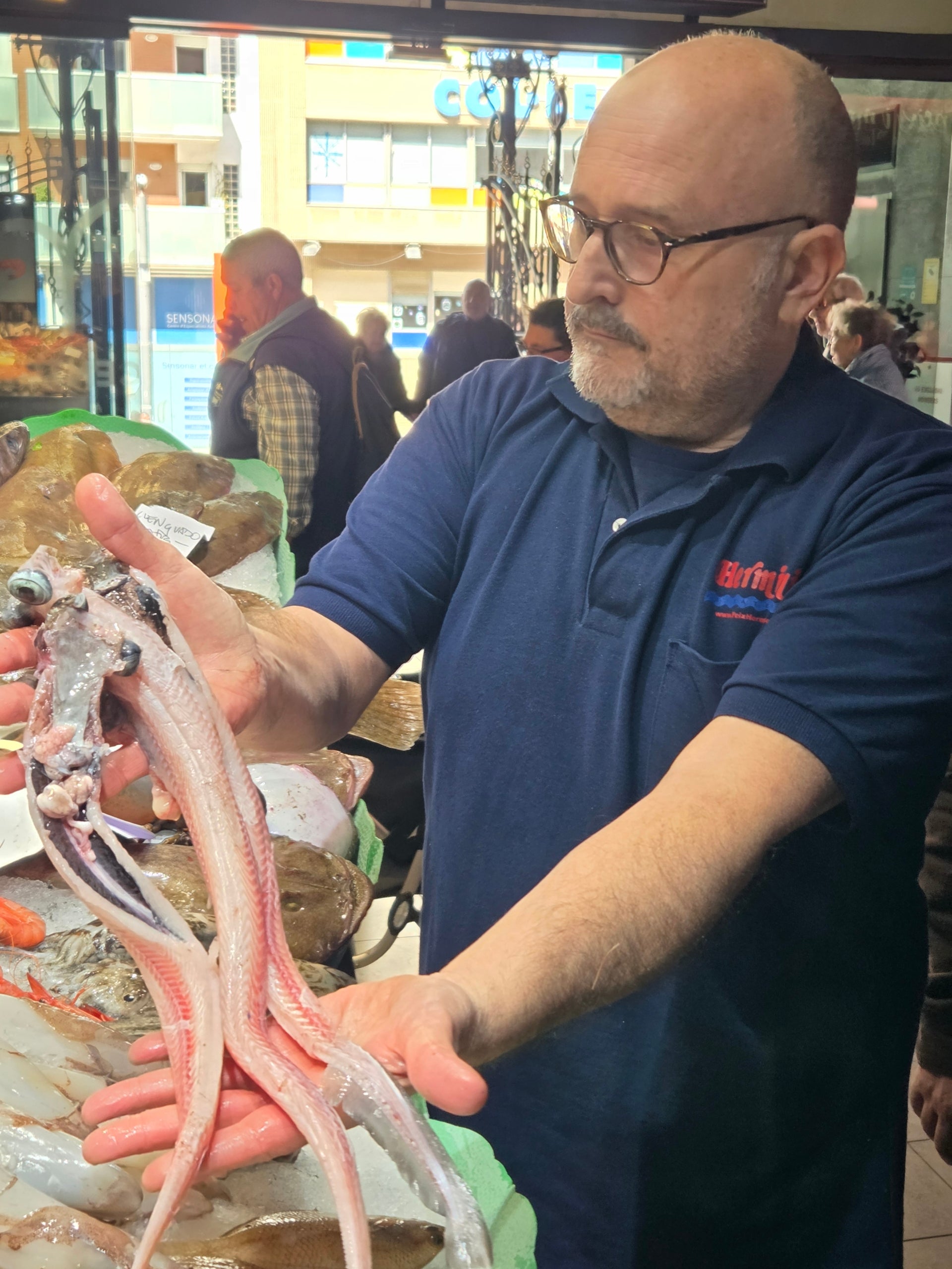 Arribem a Tarragona i la primera parada obligada és el Mercat Central on ens esperen Josep Maria Vilar, de peixos Herminia, i Xavier Veciana, pescador i cuiner ja retirat i que ha fet de la mar una filosofia de vida. Tots dos ens fan un primer tast de la cuina de romesco. Josep Maria Vilar explica que els peixos de temporada en aquesta època de l’any són la sardina i el seitó, a més de les gambes vermella i blanca, però per elaborar un bon guisat de romesco “res millor que la moixina, de la família dels taurons, un peix de carn dura i saborosa”.