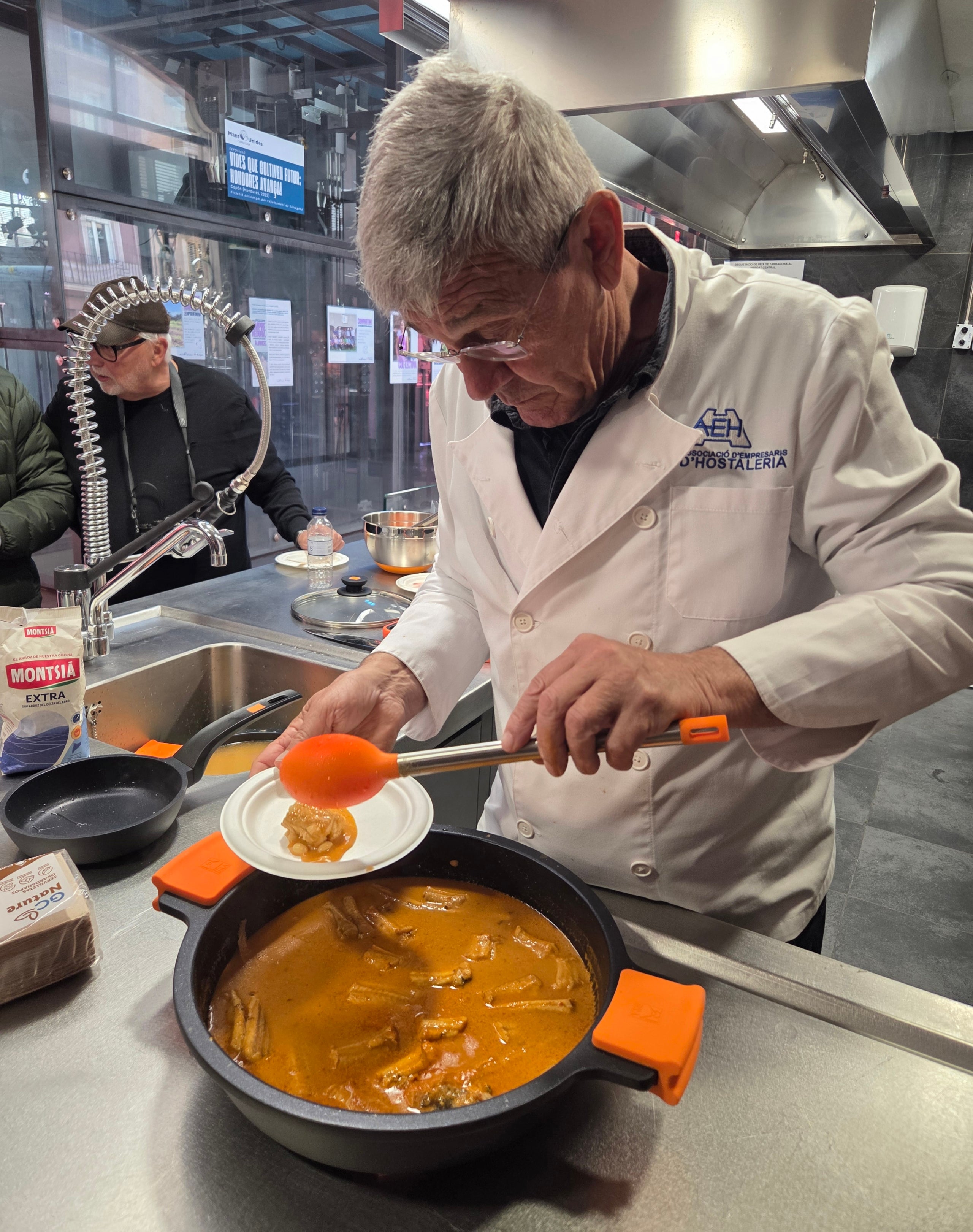 Dit i fet, Xavier Veciana entra a l’espai de cuina habilitat al Mercat Central i comença a passar per la paella el pebrot de romesco, els alls, el pa… només falten les avellanes: “El romesco no és una salsa, és una picada!” diu mentre lliga els ingredients que seran la base principal del guisat de romesco de moixina amb mongetes.