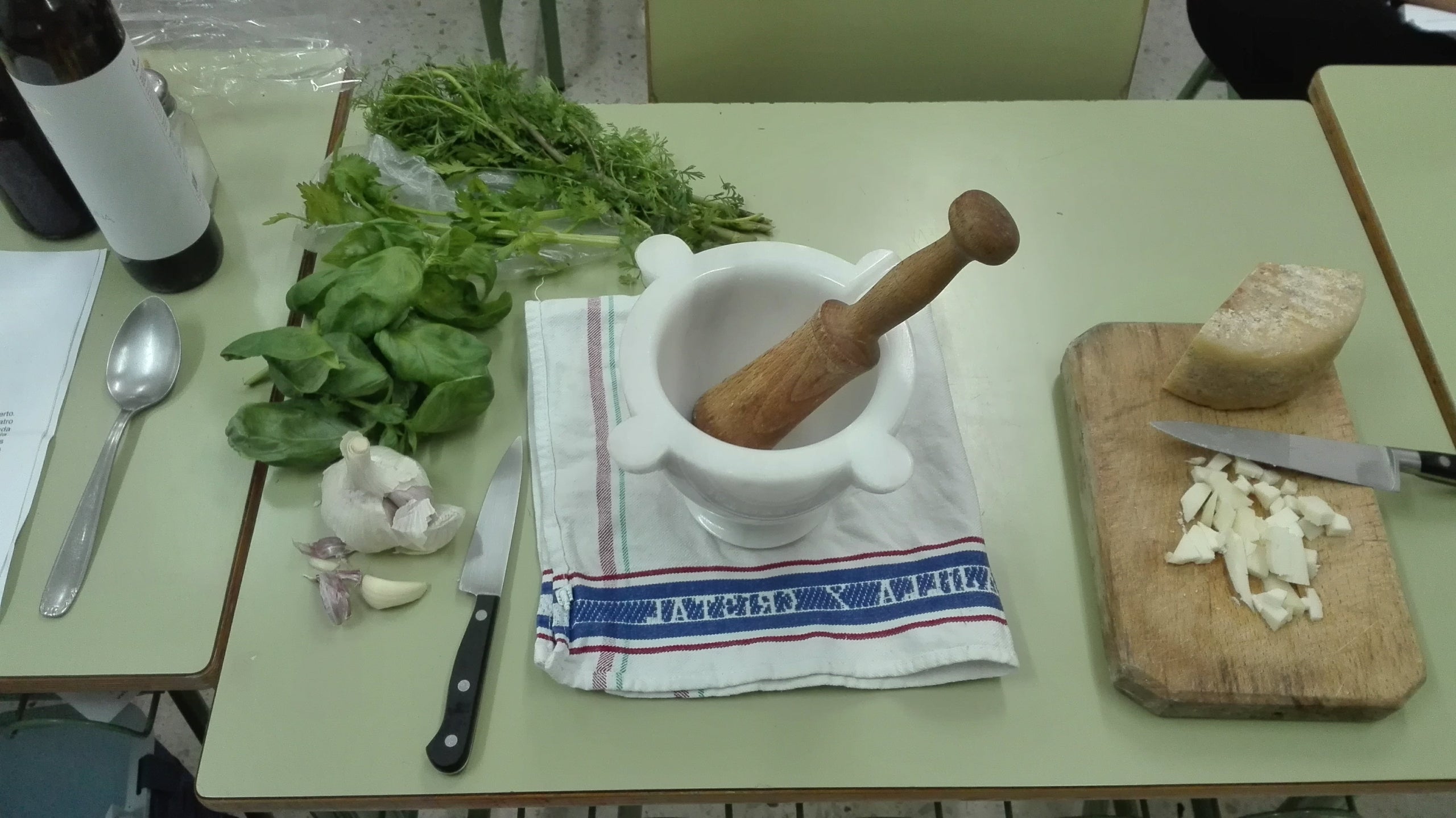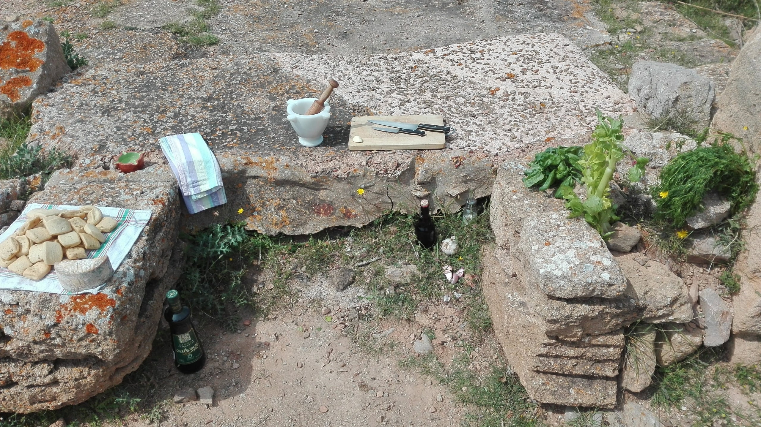 El mateix plat surt descrit en diverses receptes de L’Art de la Cuina d’Apici o De re rustica de Columel·la, entre d’altres com Cató o Ovidi, demostració de la seva importància i difusió al llarg de la mar romana. La seva elaboració bàsica o “concepte culinari” consisteix en matxucar en un morter grans d’all amb sal, formatge, unes herbes que depenen de la temporada o disponibilitat (api, cilantre i ruda al poema), vinagre i lligar-ho tot “gota a gota” amb oli, d’oliva evidentment. A pesar que solia ser formatge d’ovella, no puc evitar citar a un especialista en cuina romana que recomana fer-ho, per tal d’evocar millor el gust original, amb un formatge “tipus Maó”.