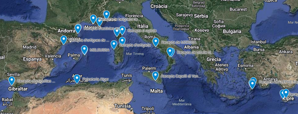 Abans de la globalització uniformadora, el producte era valorat, consumit i objecte d’un receptari específic només en ports molt concrets i definits de la Mar Mediterrània. Els punts eren: Roses i la costa de l’Alt Empordà, especialment El Port de la Selva; Salou, La Ràpita i altres llocs del sud de Tarragona; Cadis, costa de la Provença, especialment a Marsella, Niça i Pòrcaròlas, Còrsega (a Alèria i Ajaccio), a l’Alguer (Sardenya), a Nàpols, a llocs concrets de la Calàbria, a Xipre (costa de Paphos), a Gela (Sicília) i a Rodes. Aquesta illa forma part de l’etimologia del primer municipi que hem citat i és la clau de volta de la singularitat del mapa de consum. Podeu viatjar per aquest mapa, amb el nom de cada recepta local als punts marcats, clicant en aquest enllaç de Google Maps.