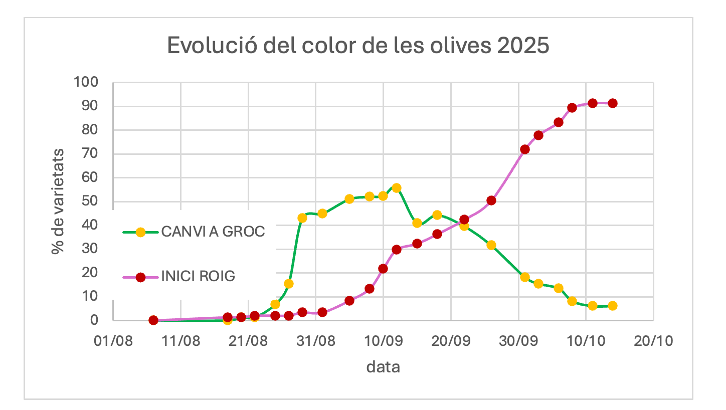 Pel que fa a la principal varietat catalana ‘Arbequina’, es troba encara en un punt de maduració inicial, amb moltes olives fent el viratge de color verd a groc i amb les primeres olives canviant a roig o morat. Alguns productors ja estan recollint-la en verd, per elaborar un primer lot d’oli verd i amarg; després, esperaran un parell de setmanes fins que la major part d’olives estiguin verolades per iniciar la campanya 2025-26.