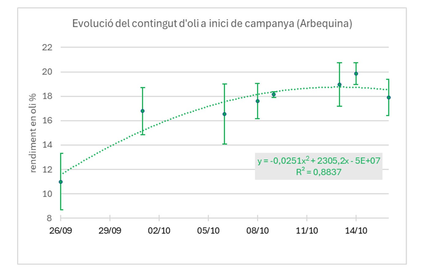 Respecte del rendiment en oli, aquest any sembla que les olives en porten bastant. La primera quinzena d’octubre, el rendiment ha passat de l’11% fins al 19%, que ja és un valor adequat per iniciar la collita. L’evolució de la corba suggereix que la síntesi d’oli està en fase final i ja no pujarà gaire més, tret dels casos on encara quedin olives verdes a l’arbre que poden seguir sintetitzant i acumulant una mica més d’oli.
