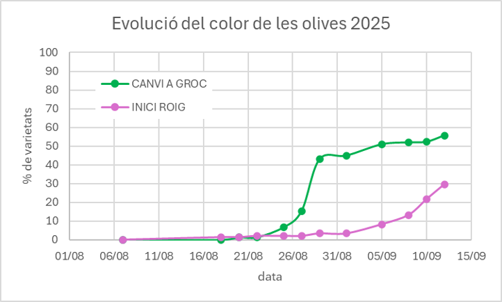 Al gràfic podem veure el número de varietats que van virant a color groc i les primeres zones rogenques. Es pot observar com a mig setembre fins un 60% de les 150 varietats que conformen la col·lecció de Mas Bové han virat de verd a groguenc, mentre que només un 30% han fet el pas definitiu a colors morats. A la col·lecció hi ha varietats molt verdes que encara estan acumulant oli, entre elles les més importants de Catalunya, pel que fa la seva extensió, com són ‘Arbequina’, ‘Morrut’ o ‘Argudell’; mentre que hi ha varietats catalanes que ja han iniciat el pas al verolat són ‘Grossal Vimbodí’, ‘Claramunt’, ‘Farga’, ‘Forastera dels Valentins’, ‘Menya’ i ‘Mançanenca de Batea’.