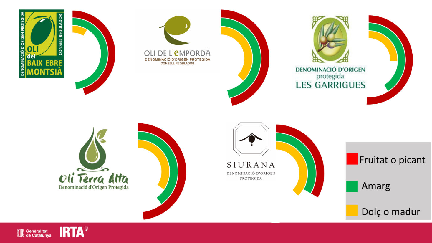 Les 5 DOP tenen perfils sensorials diferents i aquest va ser el missatge que es va voler transmetre des de l’IRTA a través de la presentació d’una prova de combinacions d’aliments amb olis. Segons un estudi de la Universitat de Bolonya de l’any 2007, els OOVE es poden combinar amb diferents aliments en funció de com són aquests aliments. I per això, uns dels treballs que s’està realitzant a la cuina experimental d’olis de Mas Bové de l’IRTA és verificar les hipòtesis d’aquest grup de recerca italià amb els olis del nostre territori.