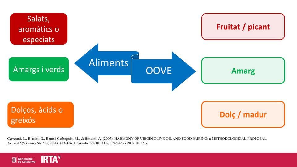 Totes aquestes combinacions es van presentar en una safata individual i els assistents van poder posar l’oli a l’últim moment i comprovar en directe la validesa de cada proposta. Cal dir que tots aquests estudis són preliminars perquè hi ha molts factors que s’han de tenir en compte i és molt difícil que un OOVE només sigui amarg o un aliment només sigui salat; hi ha molts altres atributs que s’interrelacionen i que fan que un mateix oli pugui encaixar o maridar amb molts aliments diferents. No obstant, els estudis de l’IRTA també mostren combinacions aliment-oli que no mariden tan bé.