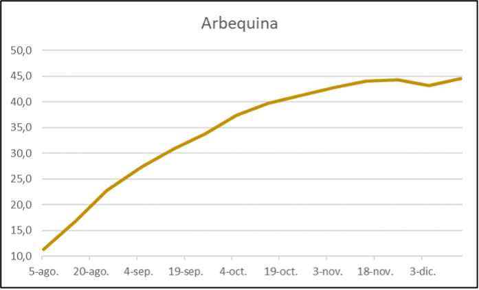 La velocitat d’acumulació d’oli al fruit és màxima durant l’agost, s’aplana una mica durant el setembre i encara més d’octubre a mitjans de novembre, aplanant-se totalment fins Nadal on sol acabar la collita. Aquesta progressiva disminució de la velocitat de síntesi d’oli està relacionada amb la temperatura ambiental que va disminuint i els dies que es van escurçant. En el cas concret de la varietat ‘Arbequina’ l’acumulació d’oli a la polpa s’estabilitza cap a mitjans de novembre. La imatge de sota mostra aquest procés, que presenta lleugeres diferències depenent de si l’arbre té més o menys collita. En tot cas, és evident que a partir de novembre l’increment d’oli es va alentint.