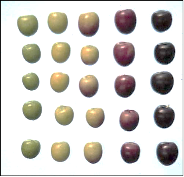 El procés de maduració és molt visual. Les olives passen del verd més o menys intens que tenen durant tot l’estiu, que va virant a groc i després apareixen clapes rogenques que van cobrint tota la pell de l’oliva i passen a un rogenc o negre profund al final del procés. De fet, si obrim les olives negres, veurem que la polpa del fruit també va canviant de color de manera similar; passant d’un verd pàl·lid a l’estiu, a un groc blanquinós a mida que la pell passa per les diferents coloracions indicades i, quan la pell ja és negra, la polpa va adquirint una tonalitat morada, començant per les capes externes i fins arribar al pinyol.