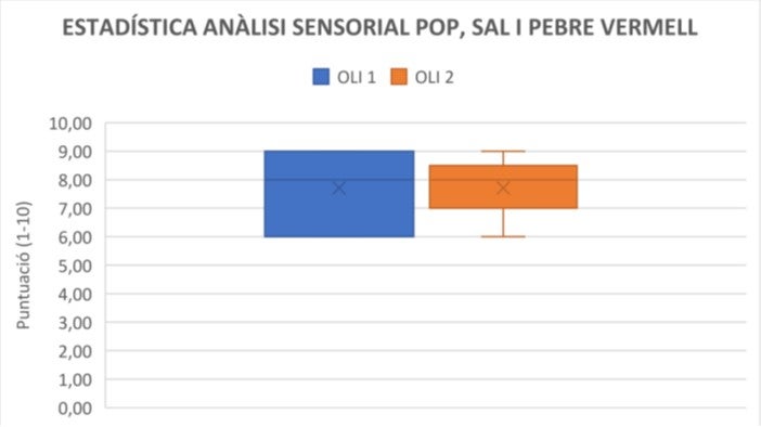 Basant-nos en una hipòtesi italiana, que estem verificant, volíem veure si el típic “pop a la gallega”, que incorpora espècies molt aromàtiques com el pebre vermell, es percep com més agradable si s’utilitza un oli aromàtic i picant, com ‘Hojiblanca’ (oli 2), en comparació amb un oli més dolç i suau com ‘Arbequina’(oli 1).