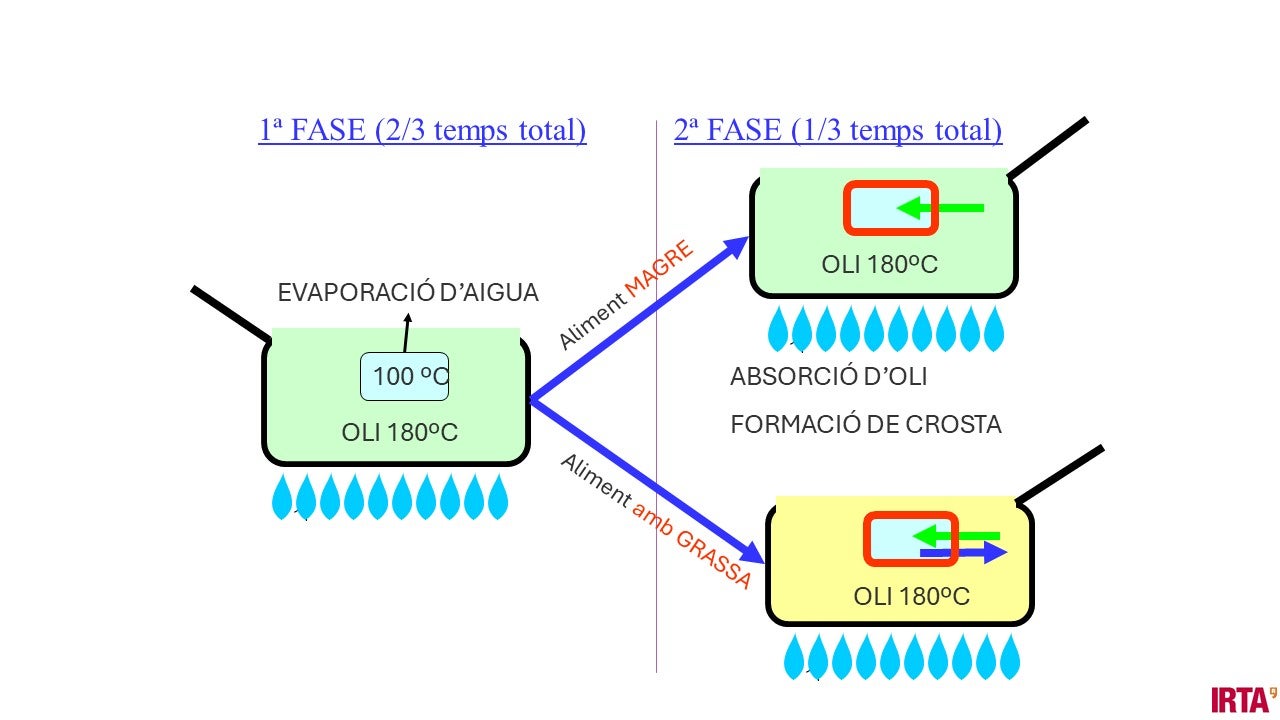 Per poder entendre com funcionen els nous sistemes de fregit hem d’entendre el fregit tradicional, el fregit per immersió. Com comentàvem en anteriors articles, el procés de fregit consisteix en dues etapes: la primera, l’aigua de l’aliment s’evapora i tenim el centre de l’aliment per sota de 100ºC; i, en l’etapa posterior, hi ha una entrada d’oli calent a l’aliment. Si l’aliment no té oli, només l’absorbirà; i si té greix, hi haurà un intercanvi de greixos. Per això, sempre es recomana no barrejar les fregidores de peix o carn amb les fregidores de patates, si no és el cas que volem obtenir unes patates amb gust a sardines o carn.